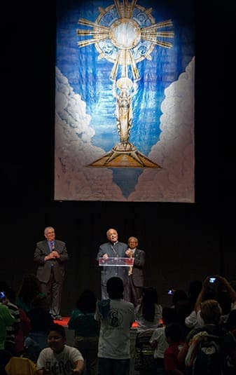 Archbishop Gregory makes a visit to the Spanish Track. Standing behind the archbishop are Angel “Cucho” Garcia, emcee, left, and Jairo Martinez, director of the Hispanic Ministry Office. Photo by Thomas Spink
