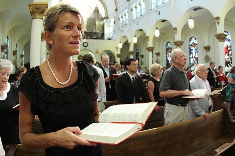 Colleen Adams, left, of St. Theresa of the Child Jesus Church, Douglasville, and Fran O'Brien of St. Peter Chanel Church, Roswell, and Frank Petraglia of St. Francis de Sales Church, Mableton, second pew, far right, sing the processional hymn during the Aug. 8 Mass for the Diocesan Pro-Life Leadership Conference at the Sacred Heart of Jesus Basilica, Atlanta.