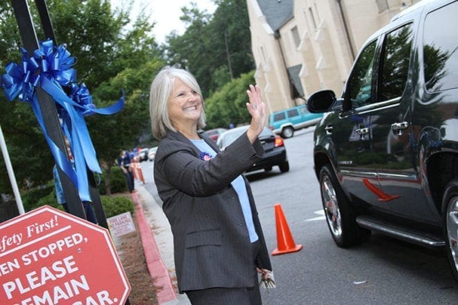 Standing in the carpool line, Ann Nagel, principal of Our Lady of the Assumption School, Atlanta, waved to parents and heard words of congratulation from car windows as the school celebrated its recognition as a 2011 National Blue Ribbon School of Excellence. Photo By Michael Alexander