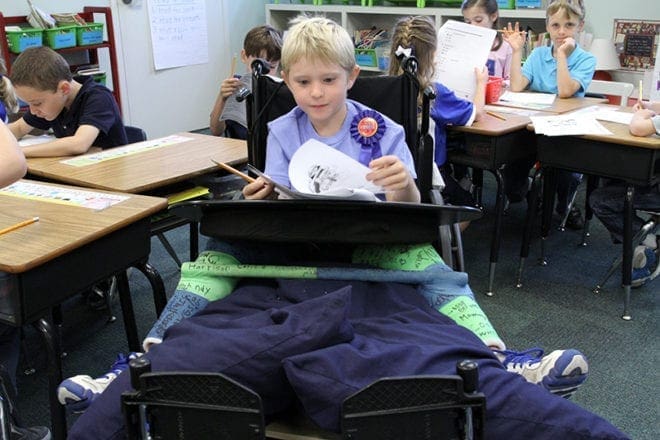 Wheelchair-bound Eli Clarkson wears a celebratory ribbon as he works on an exercise in his first grade class. His Atlanta school was named a 2011 National Blue Ribbon School of Excellence Sept. 15. Photo By Michael Alexander