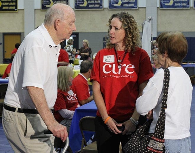 Lynne Bauman, center, talks with the grandparents of Isaac del Valle, Bill, left, and Betty O’Brien. It was Bill who made the initial request for help to the Marist School community. Bauman rallied the Marist community around the bone marrow donor testing drive, which was organized by CURE Childhood Cancer and 11Alive News. Photo By Michael Alexander