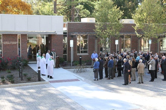 A newly constructed resource building at the Ignatius House Jesuit Retreat Center was recently dedicated on Tuesday, Oct. 25. The dedication was the capstone of the completion of the new J. Robert Fitzgerald Resource Center and also celebrated renovations to the retreat house, including an upgraded entrance and lobby atrium.