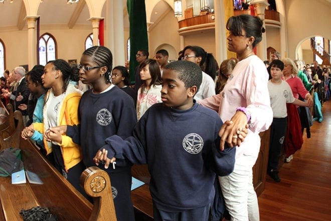 Myles Sandolph, center, and eighth-grader at St. John the Evangelist School, Hapeville, his classmate Landy Thomas, left, and their teacher Elke Silva, right, join the congregation in praying the Our Father during the 2012 Mass for the Unborn. Photo By Michael Alexander