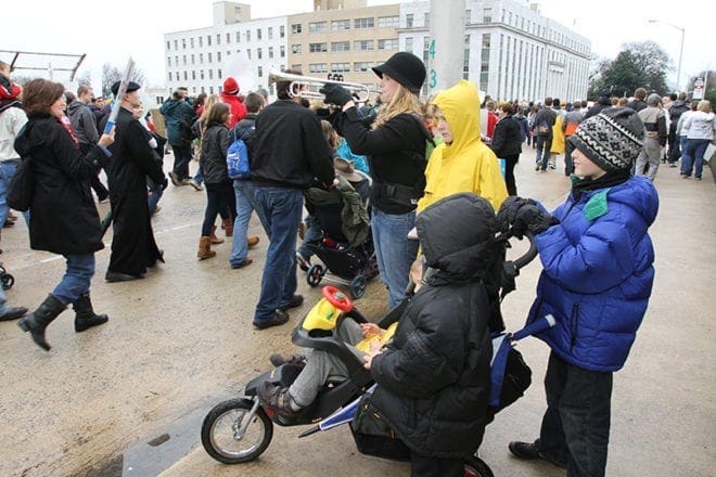 Standing with her five children, Joselyn Schutz of St. Brigid Church, Johns Creek, plays “Taps” on her trumpet as the Together for Life march makes its way down Washington Street. Photo By Michael Alexander