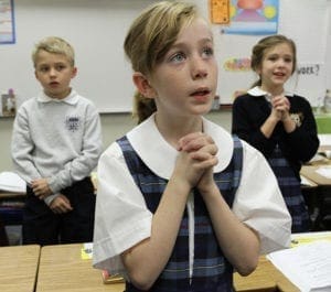 (L-r) Harrison Clifton, Ansley Fraundorf and Tess Singletary stand with their third grade classmates during morning prayer. Christ the King School opened in the fall of 1937 and today it has a current enrollment of 565 students.