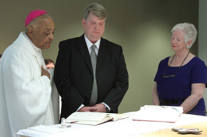 Jeffery Dean, center, payroll manager in the Archdiocese of Atlanta’s Finance Office, stands between Archbishop Wilton D. Gregory, left, and his sponsor Ann Pitra as he prepares to be confirmed and enter the Catholic Church in the Chancery’s St. Dominic Chapel, March 26. Photo By Michael Alexander