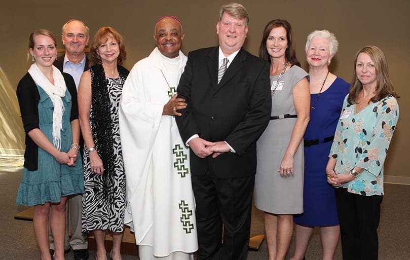 Jeffery Dean, center, payroll manager in the Archdiocese of Atlanta’s Finance Office, stands between Archbishop Wilton D. Gregory, left, and his sponsor Ann Pitra as he prepares to be confirmed and enter the Catholic Church in the Chancery’s St. Dominic Chapel, March 26. Photo By Michael Alexander
