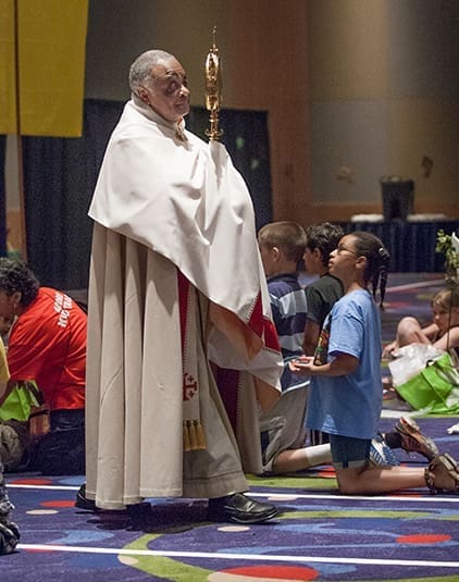 Archbishop Gregory brings the Blessed Sacrament before the children in the Adore! Kid Track. Photo by Thomas Spink/Archdiocese of Atlanta