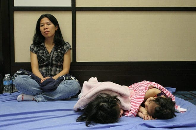 An aunt sits by in the Vietnamese Track as her two nieces sleep off to the side. Photo By Michael Alexander