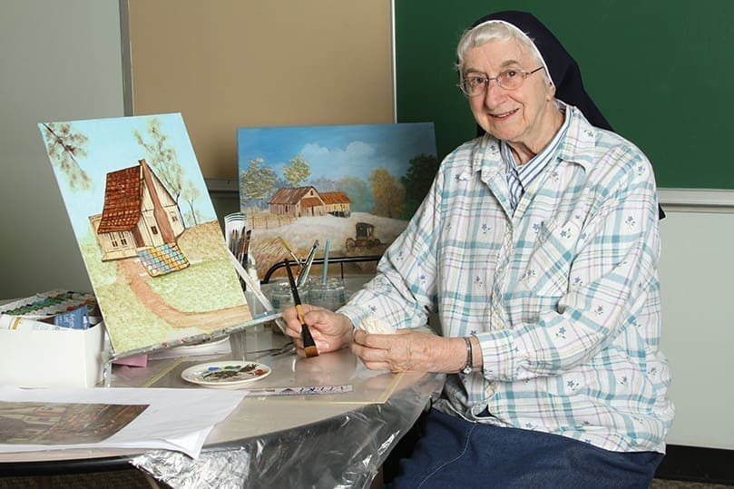 White hair peeks out from a blue veil covering her head. She wears a pendent around her neck with the unique symbol of the Good Shepherd Sisters, a cross with two hearts, along with a shepherd’s crook. She relaxes by painting, which for her is meditative, getting lost in the scene appearing on her canvas.