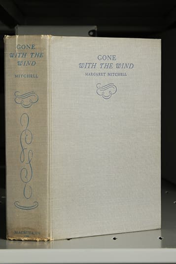 The book cover and spine of the 1936 edition copy of Gone With The Wind, presented by Margaret Mitchell for her father Eugene Muse Mitchell, is displayed on a shelf in the Archdiocese of Atlanta archives. Photo By Michael Alexander