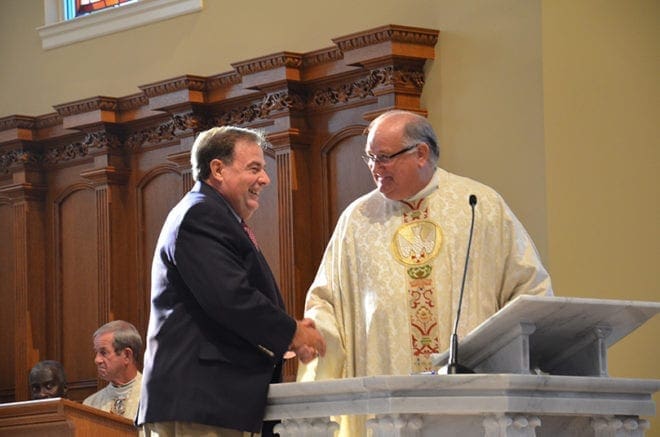 Father Paul Flood, pastor, shakes the hand of Angelo Sampona, building committee chair, during the Sept. 15 anniversary Mass. Photo by Cindy Connell Palmer/Archdiocese of Atlanta