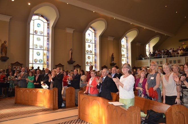 Parishioners clap excitedly at the end of the anniversary Mass, which was celebrated in a completely remodeled church. The project took four months to complete. Photo By Cindy Connell Palmer/Archdiocese of Atlanta