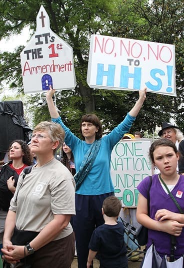 Michelle Goodsell of St. Michael the Archangel Church, Woodstock, holds two protest signs above her head as she attends the Stand Up For Religious Freedom Rally, March 23. Photo By Michael Alexander