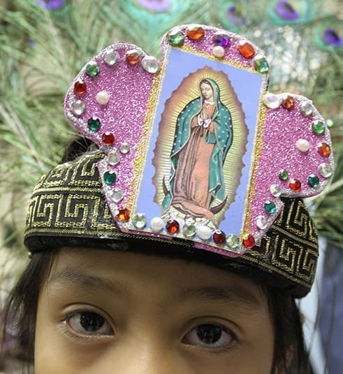 Donning ornate headdresses with colorful peacock feathers and handmade costumes featuring an Aztec-inspired design, 40 dancers processed into the sanctuary at St. Oliver Plunkett Church at the end of a Mass honoring the feast day of Our Lady of Guadalupe.