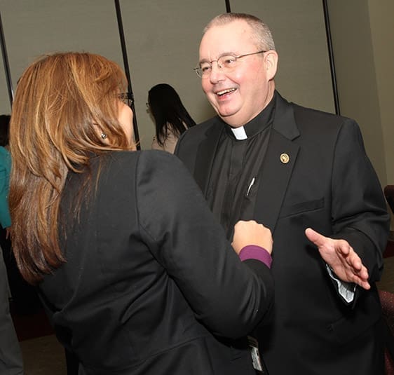 Bishop-designate David Talley receives congratulations Jan. 3 from Chancery staff member Kirial DeRozas-Miles, who was his administrative assistant when he served as vocations director and chancellor. She is now executive assistant to Bishop Luis R. Zarama.