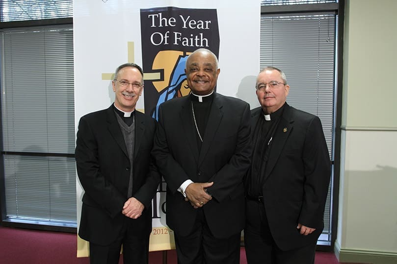 Archbishop Wilton D. Gregory, center, is joined by Bishop Luis Rafael Zarama, auxiliary bishop of Atlanta, left, and the pope’s newest appointment, Bishop-designate David Talley, following a morning press conference Jan. 3.
