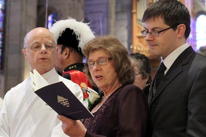 Earl Buckley, an ordination candidate from St. Matthew Church, Winder, stands with his wife Terri and his son Steven during the processional hymn. Photo By Michael Alexander