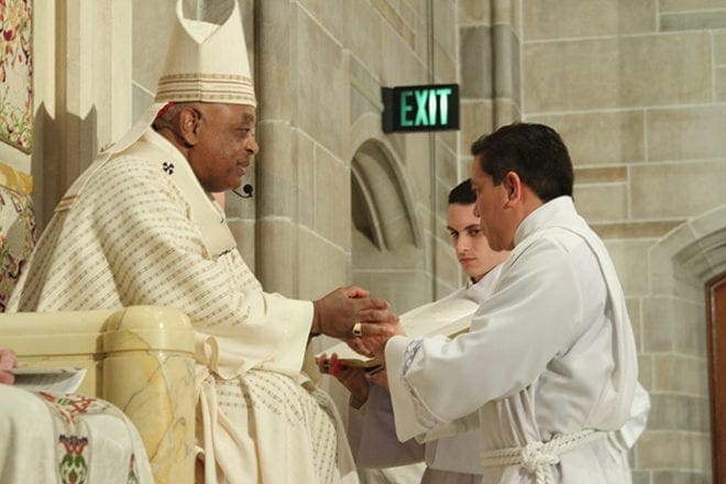 At the Mass, the wives of the deacon candidates led the procession of dozens of deacons and priests into the cathedral. Bishop-designate David Talley and Auxiliary Bishop Luis R. Zarama joined Archbishop Gregory in celebrating the liturgy.