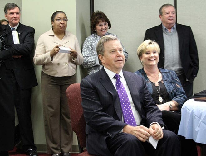 Joe Krygiel’s wife Pam joins him during his Feb. 19 retirement party at the Archdiocese of Atlanta Chancery. Photo By Michael Alexander