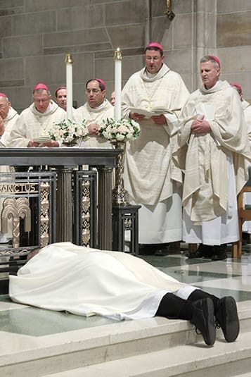 The marble crucifix in the cathedral was flanked with towering urns of flowering spring branches and bowers of white roses and lilies arched over the Mary and Joseph side altars as the rite continued with the congregation praying for the future bishop while he lay prostrate before the altar.
