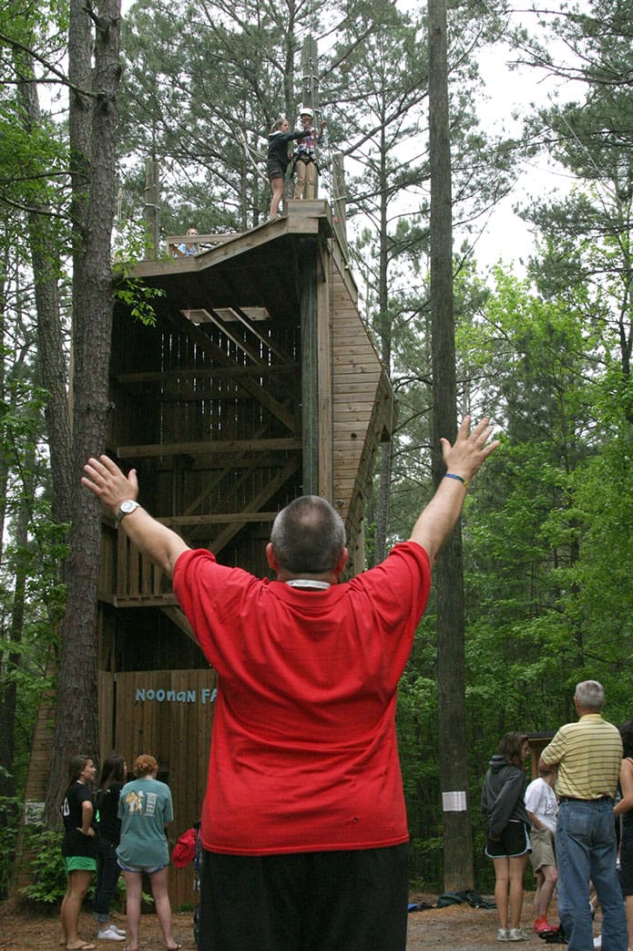 From ground level Monsignor David Talley, chaplain for the Disabilities Ministry, verbally encourages a camper preparing to ride the zip line from its 40-foot platform starting point. For 44 years the Archdiocese of Atlanta has embraced and supported Catholics with disabilities through its weekend camp ministry. Photo By Michael Alexander