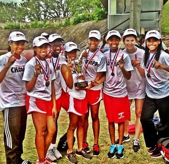 The Our Lady of Mercy High School track and field team celebrates their Class A state championship victory. Pictured are (l-r) Deja Barthell, Morgan McClure, Landy Thomas, Pauline Cobb, Anike Thomas, Teona Myles, Rachael Powers and Leah Banks