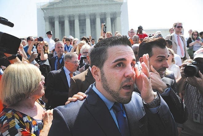 Jeff Zarrillo, center, and Paul Katami, right, plaintiffs in the case against California’s same-sex ban known as Proposition 8, wipe away tears and greet supporters as they depart the Supreme Court in Washington June 26. CNS photo/Jonathan Ernst, Reuters