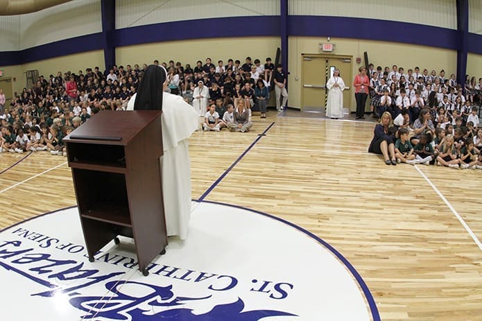 Principal and Dominican Sister Mary Patrick, standing in front of the podium, leads everyone in a prayer of thanksgiving following her announcement that St. Catherine of Siena is a 2013 National Blue Ribbon School. It is the only Catholic school among the eight Georgia schools recognized by the U.S. Department of Education. Photo By Michael Alexander