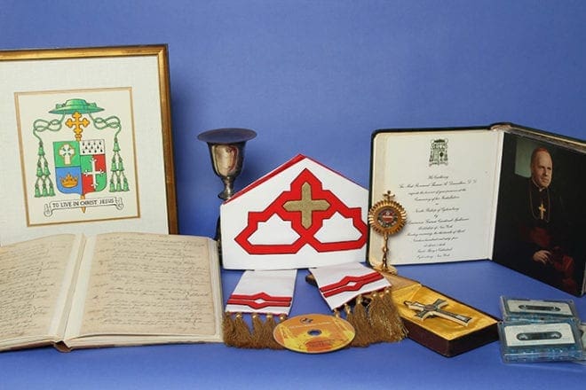 The Archdiocese of Atlanta archives includes a vast collection of artifacts such as (clockwise from left): a sacramental register from the Purification of the Blessed Virgin Mary Church, Georgia’s first Catholic Church, the late Archbishop John F. Donoghue’s Coat of Arms, a number of textiles and vestments like a bishop’s miter, a chalice and reliquary from the estate of the late Father John Druding, an album of photos from the late Archbishop Thomas A. Donnellan’s installation, audio of talks and events in various formats, and a cross holding a relic of St. Pius X. Photo By Michael Alexander