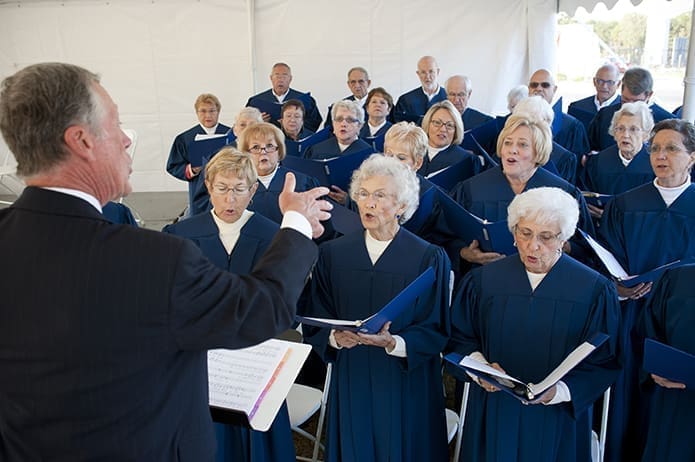 Art Hargrove directs choir members from Christ Our King and Savior Church, Greensboro, at the blessing of the new hospital facility, which serves Greene County and the Lake Oconee area. Peter Faletti, music director, accompanied the choir. Photo by Dennis McDaniel