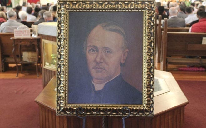 A painting of Father Thomas O’Reilly is displayed in the back of the Shrine of the Immaculate Conception, Atlanta, during the Nov. 17 Masses. Photo By Michael Alexander