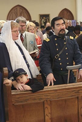 David Furukawa and his four-year-old son William were two of the five people who appeared in period uniforms as representatives of the 21st Ohio Volunteer Infantry. Standing in the pew with them is Furukawa’s wife Kathleen, left. Photo By Michael Alexander