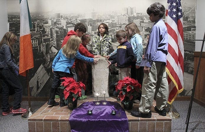 ATLANTA—The Atlanta Zero Mile Marker is hard to find. It’s tucked below a parking deck at Underground Atlanta, usually behind locked doors. But on Sunday, Nov. 17, Irish and American flags and lit candles flanked the yard-high stone marker.