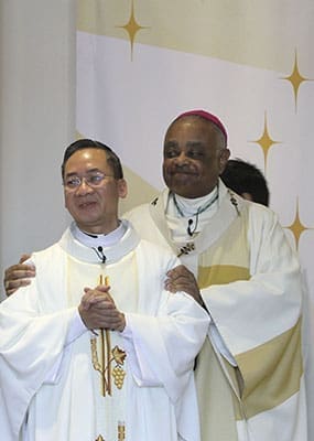 With the smile of a proud ordinary, Archbishop Wilton D. Gregory presents the first pastor, Father Francis Tran, to the congregation of the Holy Vietnamese Martyrs Church, the newly named parish of Gwinnett County. Photo By Michael Alexander