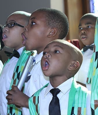 (R-l) Three-year-old Toritsé Edun of Sts. Peter and Paul Church, Decatur, joins fellow children’s choir members Arinze Chukwuma and Christopher Bridges as they provide the music during the Jan. 18 Martin Luther King Jr. Eucharistic Celebration. Photo By Michael Alexander