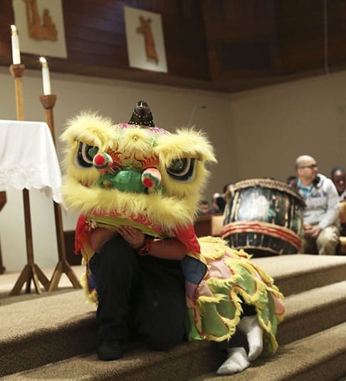 Sixth-grader Don Vo and second-grader Daniel Nguyen came down the center aisle under the dragon during the Vietnamese Lan Dance. They were one of three cultures that participated in the call to worship. The other two were the Hispanic and Nigerian communities. Photo By Michael Alexander