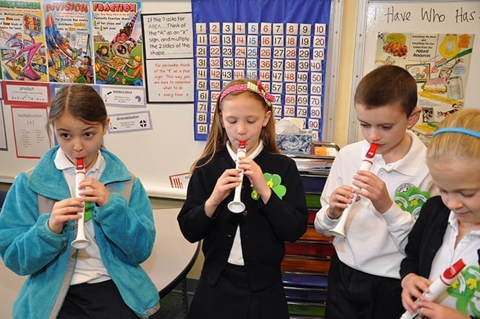 Visitors at Grandparent and Special Others’ Day at Our Lady of the Assumption School, Atlanta, were treated to Irish fare and student performances. The third-grade flute players, left to right, Gigi Glennon, Sabrina Boyd, Liam O’Toole and Caroline Baljet, play some favorite tunes on the instruments.