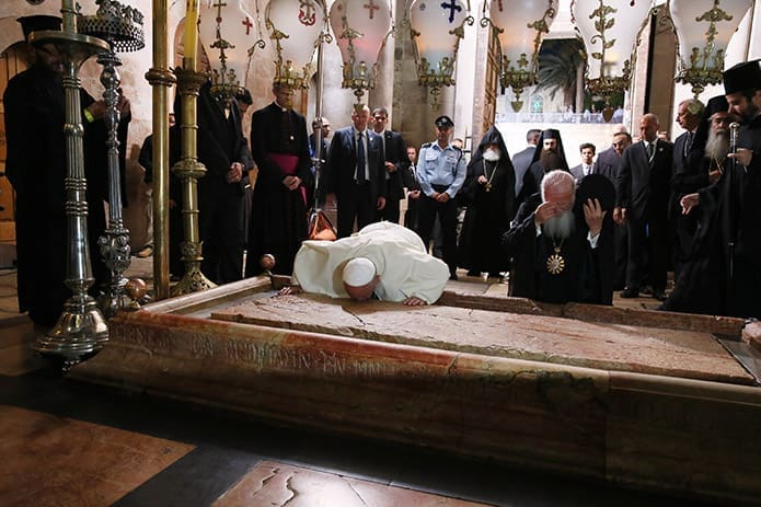 “We need to believe that, just as the stone before the tomb was cast aside, so, too, every obstacle to our full communion will also be removed,” the pope said May 25 during a prayer service at the Church of the Holy Sepulcher.