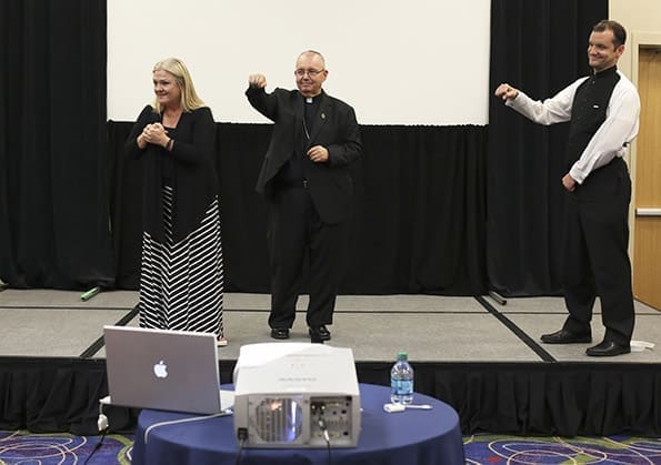 Displaying the word for “yes” in the American Sign Language (ASL) track, Bishop David Talley, center, encourages the deaf community to enjoy their experience at the Eucharistic Congress with the help of Lisa Palak, left, and Father Shawn Carey. Father Carey is director of the Office of the Deaf Apostolate for the Archdiocese of Boston. Photo By Michael Alexander