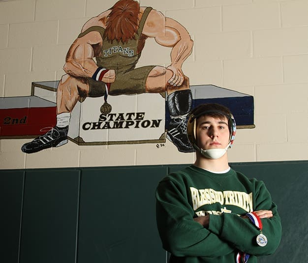 Staff photographer Michael Alexander received a first-place Catholic press award for best photograph – portrait category for his photo of wrestler Evan Strawn of Blessed Trinity High School. Photo By Michael Alexander