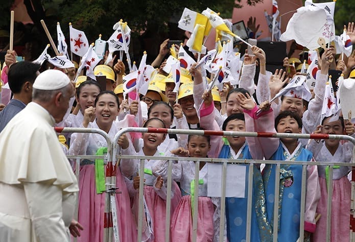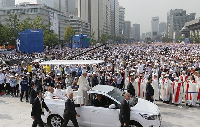 The pope urged Korean Catholics to “show evangelical concern for the less fortunate, the marginalized, those without work and those who do not share in the prosperity of the many” and to “firmly reject a mindset shaped by suspicion, confrontation and competition.”