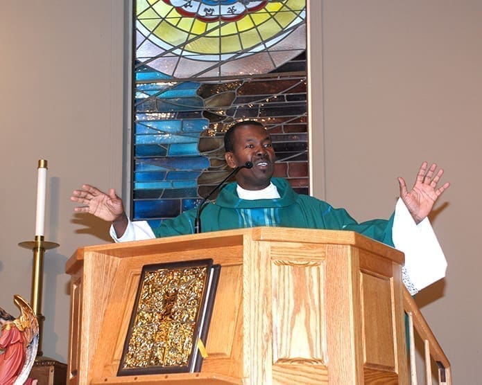 Msgr. Pierre, president of the Catholic University of Notre Dame of Haiti, spoke about the devastating earthquake and the recovery of his country during a visit to St. George Church in Newnan July 26-27. The priest concelebrated Masses with Father Henry Atem, pastor, throughout the weekend.