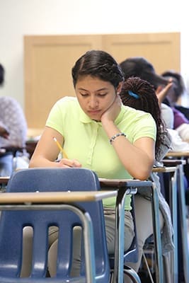 Fourteen–year-old Giselle Ayala, of Norcross, and the rest of the incoming freshman class at Cristo Rey Atlanta Jesuit High School, Atlanta, take a diagnostic placement test to assess their skills in areas like English, math and writing. Photo By Michael Alexander