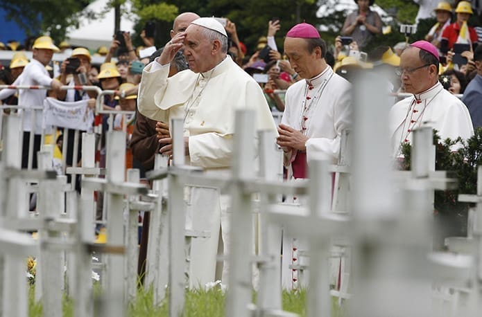 During his homily on the muddy grounds of Haemi Fortress, Pope Francis urged more than 40,000 people—including young Catholic leaders from 22 Asian countries—to “reflect God’s love.” He reminded them it was their “right and duty to take part in the life of (their) societies.”