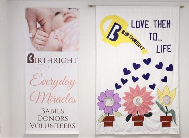The two banners hanging on the wall of Birthright Atlanta’s office are from past national conventions. Photo By Michael Alexander