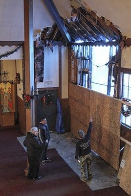 Father Philip Scott, left center, pastor of Epiphany Byzantine Catholic Church, observes the damage to the Roswell church’s ceiling and wall with his maintenance crew. Early Sunday morning, Dec. 14, an arsonist allegedly set the house of worship on fire. Photo By Michael Alexander