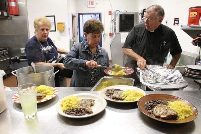 In one example of pastoral outreach, (r-l) Deacon Norm Keller, his wife Barbara and fellow St. Joseph Church parishioner Joan Lopez prepare meals for homeless men in drug recovery at a Marietta facility. The Kellers are also active in prison and jail ministry. Photo By Michael Alexander