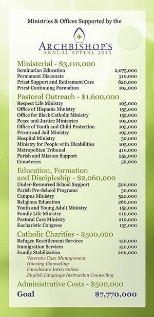 The 2015 Archbishop’s Appeal theme is “All this I do for the sake of the Gospel.” The fundraising goal is $7,770,000.