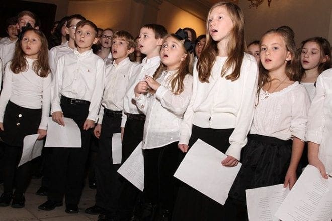 (Front row, l-r) Rowan Blankenship, Lincoln Blankenship, Luke Wilborn, Nicholas Houlihan, Lucy Wright, Charlotte Wearne and Sutton Wearne join fellow choir members from St. John Bosco Academy in Suwanee as they sing “Dona Nobis Pacem” and “Silent Night” during the Nativity dedication ceremony. Photo By Michael Alexander